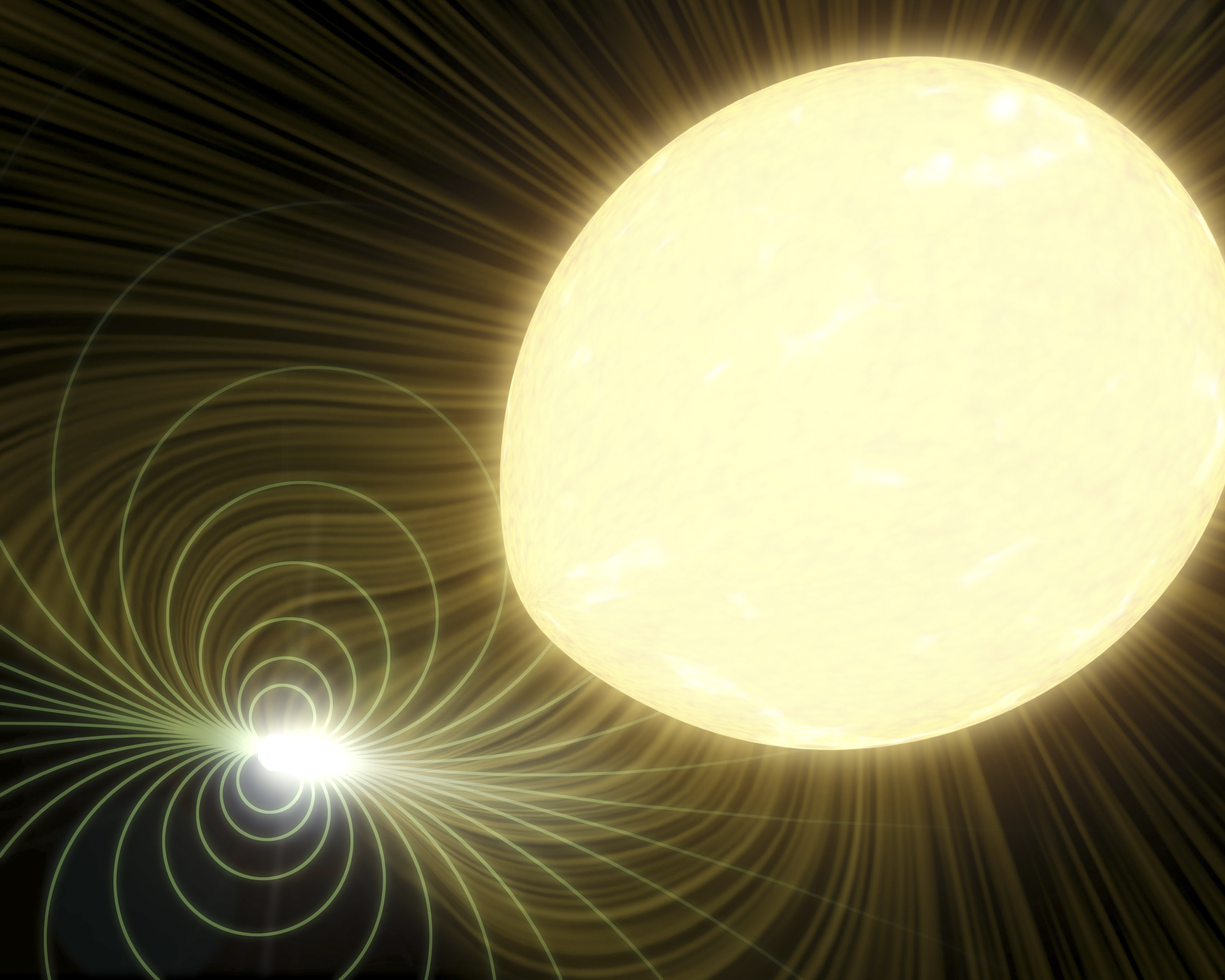 In this image, the white dwarf is represented as the little white ball to the lower left. The green lines represent the white dwarf's magnetic fields, and the white wisps are the winds from the companion star. Material from the companion stars' winds are being picked up by the white dwarf's magnetic fields, and funneled into the dwarf's "north" and "south" poles. Astronomers think that the location of the bright hot spot on the white dwarf's southern pole indicates that the star is tilted, with its southern end facing the companion star. The partner star is represented as the large yellow ball to the right.