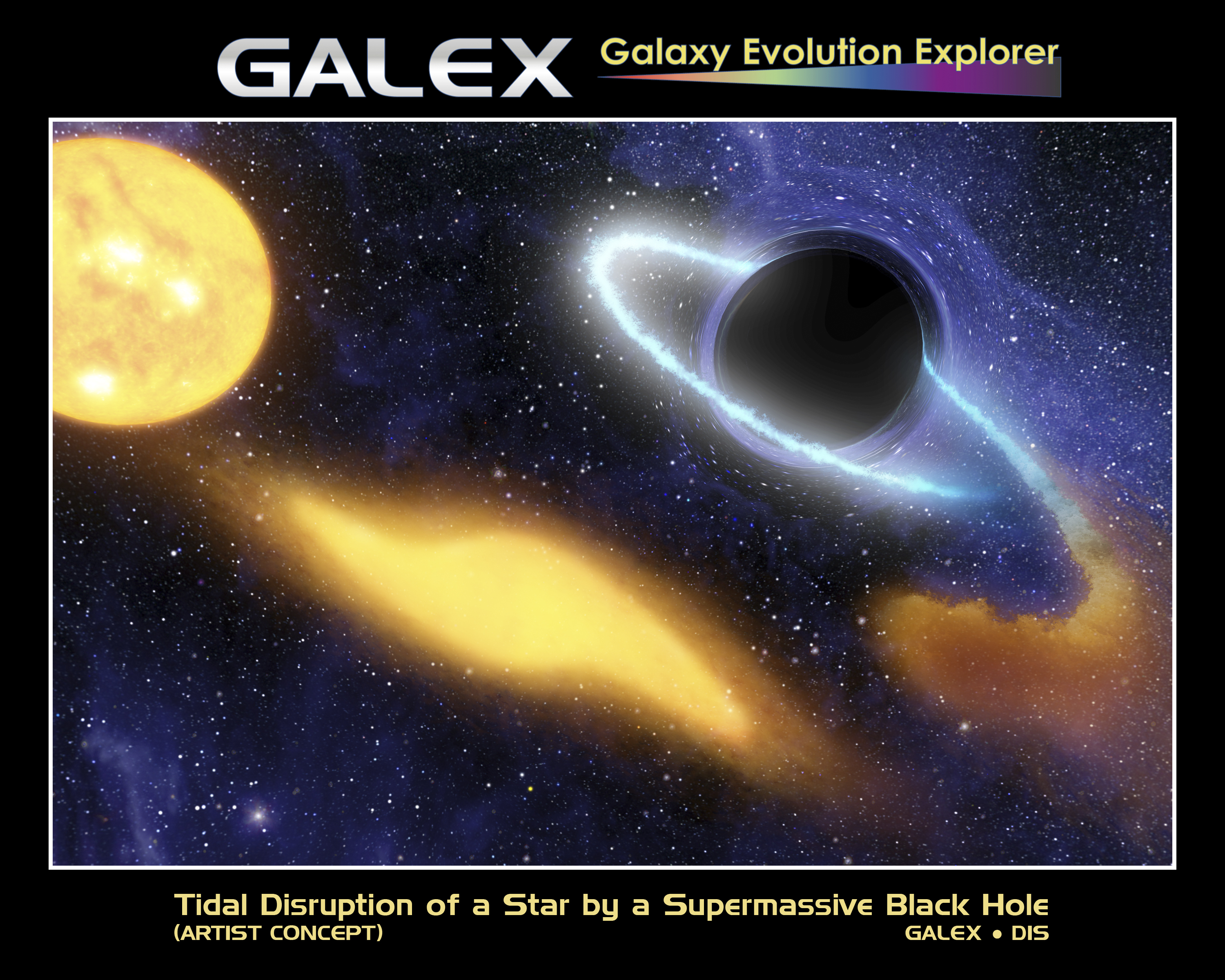 The artist's concept chronicles the star being ripped apart and swallowed by the cosmic beast over time. First, the intact sun-like star (left) ventures too close to the black hole, and its own self-gravity is overwhelmed by the black hole's gravity. The star then stretches apart (middle yellow blob) and eventually breaks into stellar crumbs, some of which swirl into the black hole (cloudy ring at right). This doomed material heats up and radiates light, including ultraviolet light, before disappearing forever into the black hole. The Galaxy Evolution Explorer was able to watch this process unfold by observing changes in ultraviolet light.