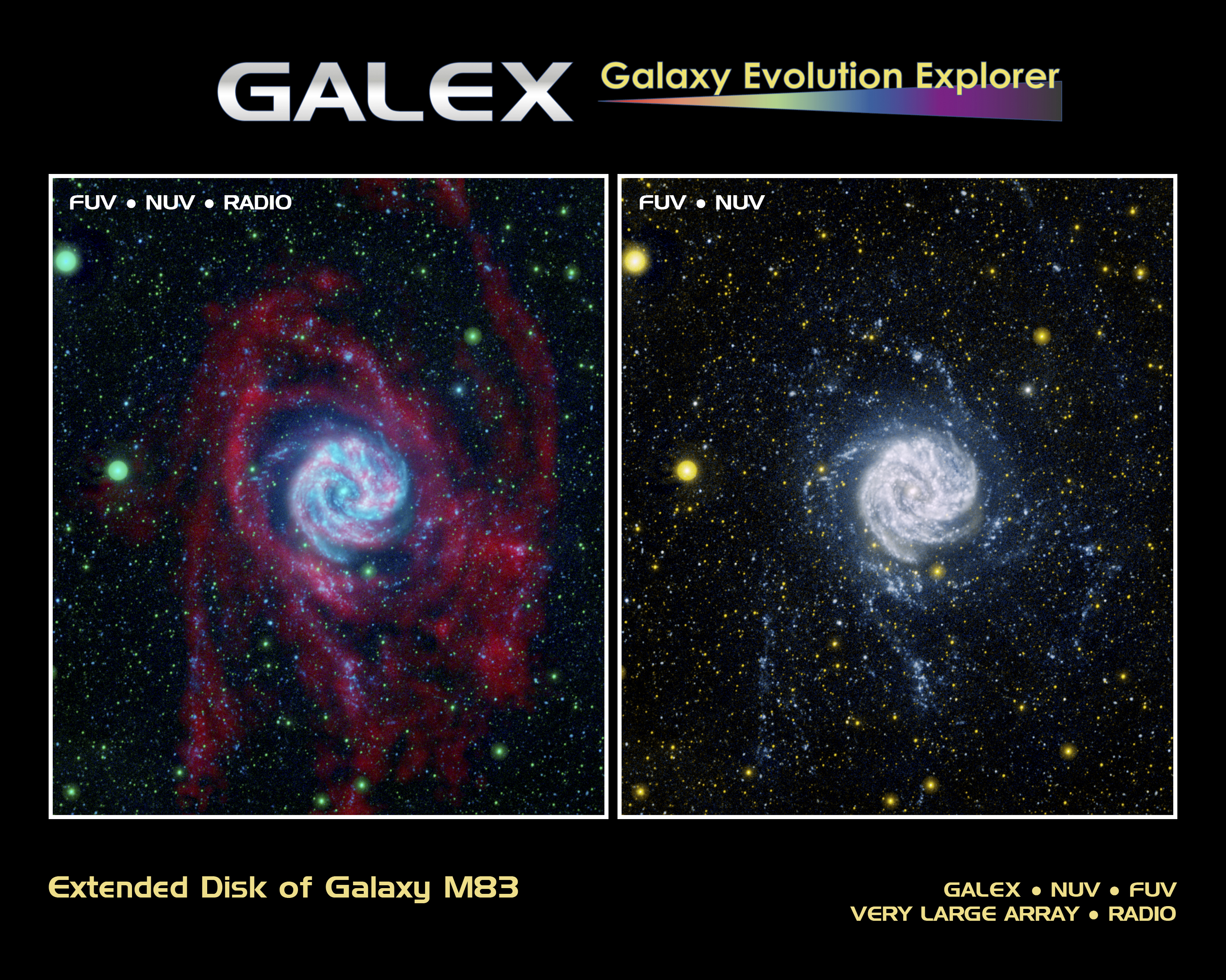 In the Galaxy Evolution Explorer image on the right, near-ultraviolet light (or longer-wavelength ultraviolet light) is colored yellow and far-ultraviolet light is blue. In the combined image at the left, far-ultraviolet light is blue, near-ultraviolet light is green, and the radio emission at a wavelength of 21 centimeters is red.