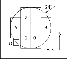 The LFC focal plane holds 6 2k x 4k science grade CCDs, placed in a symmetric cross shaped pattern. The unvignetted f/3.26 beam presented by the Wynne corrector is roughly 24 arcminutes in diameter (see Figure 2). This CCD layout was chosen to minimize the amount of vignetted silicon in the focal plane, and provide a pattern well-suited for tesselation. The CCDs in use are SITe, thinned, backside illuminated devices with AR coating - see the link below for a representative QE curve. A cooled guide CCD is also located in the FP - it is partially vignetted and housed in a corner of the cross shaped pattern of the science CCDs, labeled "G" in Figure 2 (upper right of Figure 1). Upon readout, the mosaic data is stored in 6 separate files, ending with a suffixed number from 0-5. This number maps the file to one of the CCD locations on the focal plane, as indicated in Figure 2. When displaying images from individual chips onscreen, some of the frames will not be shown in the cannonical "North-up East-left" orientation, because of the CCD readout configuration. The table linked below shows the proper sky orientation for each chip as it is displayed onscreen. |