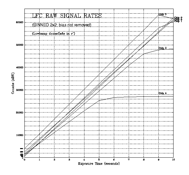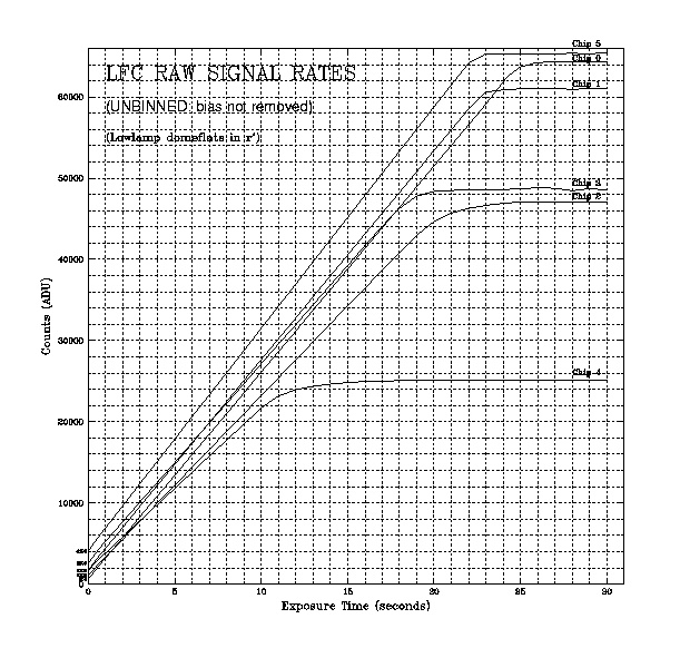 5.b. DewarThe LFC dewar is large enough to hold LN2 for over 24 hours. The daycrew typically fills the dewar once during the day. Dry nitrogen is continuously blown across the LFC dewar window at 5 PSI. If the weather is very humid you may want to ask the daycrew for more (~10 PSI). If condensation starts to form on the entrance window, you will see dark blobs grow near the center of the LFC field (upper left of chip 0, upper right of chip2...). 5.c. FiltersLFC Filter SpecsCustom LFC Filters5.d. ShutterThe shutter is comprised of two large rectangular blades. While one moves away from the field to start an exposure, the other moves over the field in the same direction to end an exposure, thus providing uniform illumination. The shutter will NOT go faster than 0.6 seconds. You will receive all sorts of trouble if you try to go faster than 0.6 seconds. The shutter is very stable at and above 0.6 seconds. The linearity curves show that the chips are very linear all the way down to 0.6 seconds. There is no light leak around the shutter, you can take bias frames during the day if you want. 6. Calibration Images6.a. Bias Frames