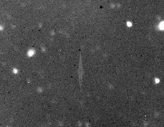 Note the LFC command 6.e. Defects / FeaturesThe left sides of the ccds (column 1 to about column 75) are ~ 30 to 100 counts "hotter" than the rest of the chip. This is in the bias, and subtracts out nicely. The field of view is unvignetted from the center of the mosaic to a circle about 22′ out from the center. From this circle and continuing out to the field edge (22′ to ~ 25′) the field is up to 10% vignetted by the Wynne corrector lens. You will see the vignetting pattern at the outer edge of each chip, especially chips 4 and 5. Look out for condensation "blobs" that might appear near the center of the mosaic field when the humidity gets very high. If this happens to you, have somebody check that the dry nitrogen is flowing over the dewar window. If it is, the dry nitrogen flow should be turned up. Each chip has a few bad columns and a few small dead spots. Chip 4 has two bad columns down the center of the chip. Chip3 has small, in-focus "marks" (dare I say, "spooges") all over the ccd (need light to see them and you have to look close). These are defects on the surface of the ccd, and they will flatten out. The 6 ccds are wired together in pairs to one of three controller boards. As a result, if something saturates (star, background) on one chip you will see a "ghost" of the saturation on the chip that shares the board. The ghost is usually tens of counts, which you can remove later through filter processing. In the image on the right, the core of a bright star saturated on chip 0 during a long exposure, which led to "bloom" trails. The pixels that actually saturated show up in the same location on chip 1, seen here. 7. Displaying Your ImagesYou can use Ximtool as a stand-alone to display your images. If you want to use iraf you need to append a .fits to each image filename to keep iraf happy. And note that the images that LFC writes are unsigned integers; iraf wants to display signed integers by default. You can use the IRAF toggle to scale the output image data to iraf friendly signed integer values. Here's the original ccdcom explanation (this was verified to work on LFC images in February 2005):