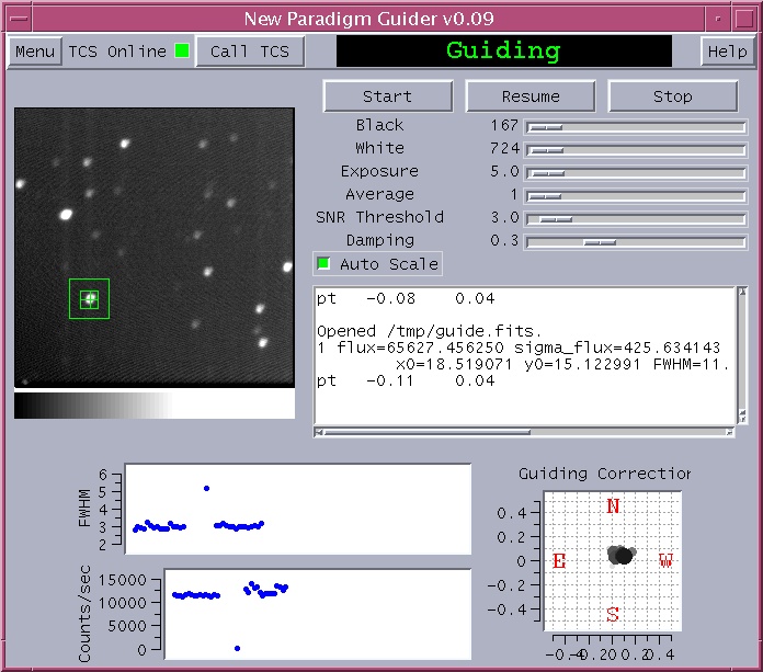 A typical exposure and guiding sequence: The guider crashes and dumps core every once in a while. This may be a feature to keep you awake. Also note that the guider isn't happy when you move the guide box too near to the edge of the field (either manually or with a guided offset). Crazy things will start to happen in this case, so quit the guider and simply restart it. The strip charts are nice tools to help you gauge seeing and sky transparency. The display scales automatically by default. If you don't like this, uncheck the Auto Scale button. The background level is determined from the sky box, so if a bright star is in the field, you may not like the autoscale. 13. Dithering / Telescope CommandsThe guider provides communication between the LFC and the telescope. The guider must be running for the following telescope commands to work: