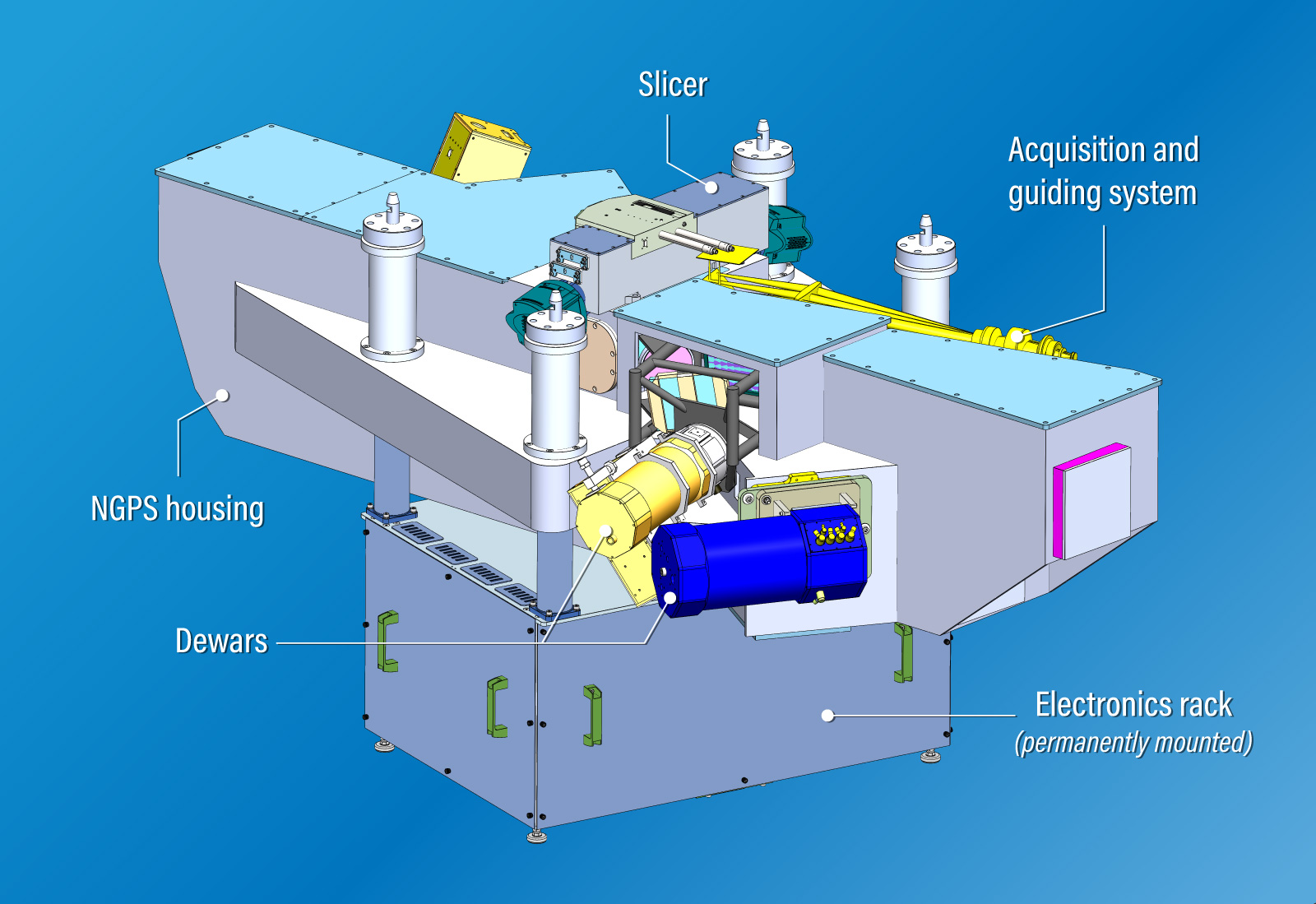 No. 10 Summer 2022 NGPS UpdateBy Lin Yan (Caltech) ![]() Graphic illustration of the NGPS system with various major components. The bottom light blue box is the electronic rack. The dark blue tube shows the R & I spectrograph channel and the yellow tube is the U & G channel. On the top sits the slicer integrated with the calibration unit. The preliminary designs for the spectrograph channels and the calibration unit have been approved for manufacturing. The electronic rack design is pending review. (R. Bertz/Caltech) The Next Generation Palomar Spectrograph (NGPS) has achieved several major development milestones this year. On May 6, 2022, the science board for the NGPS project met virtually and discussed the status of the project and the path to commissioning in mid-2023. The meeting attendees included members from COO and NIAOT, as well as representatives from Yale University and JPL. The project’s status report presented the following accomplishments: