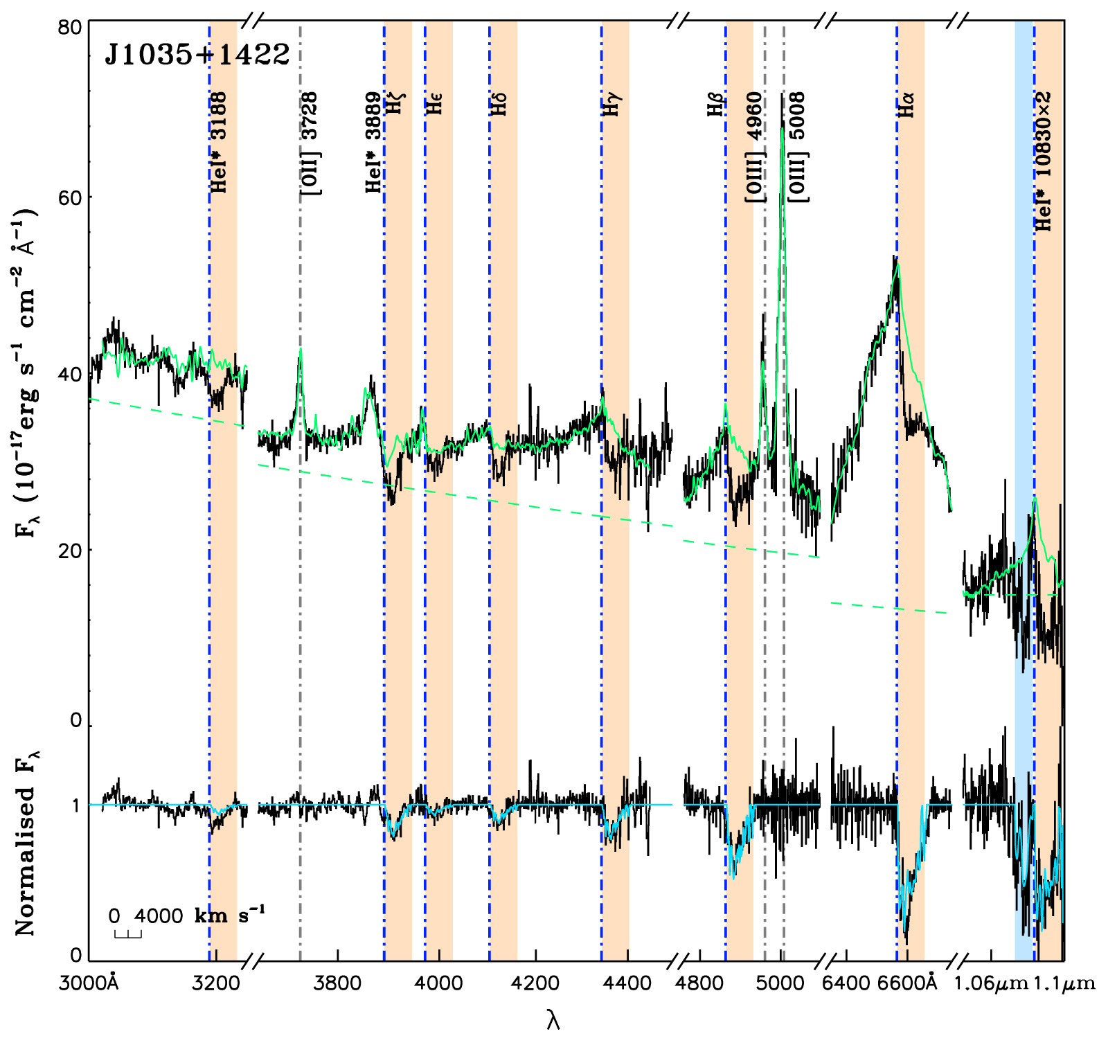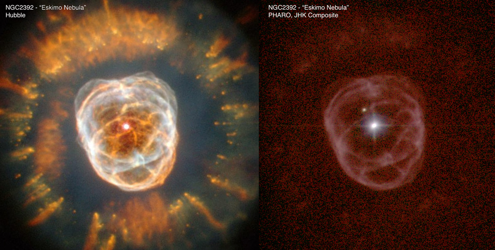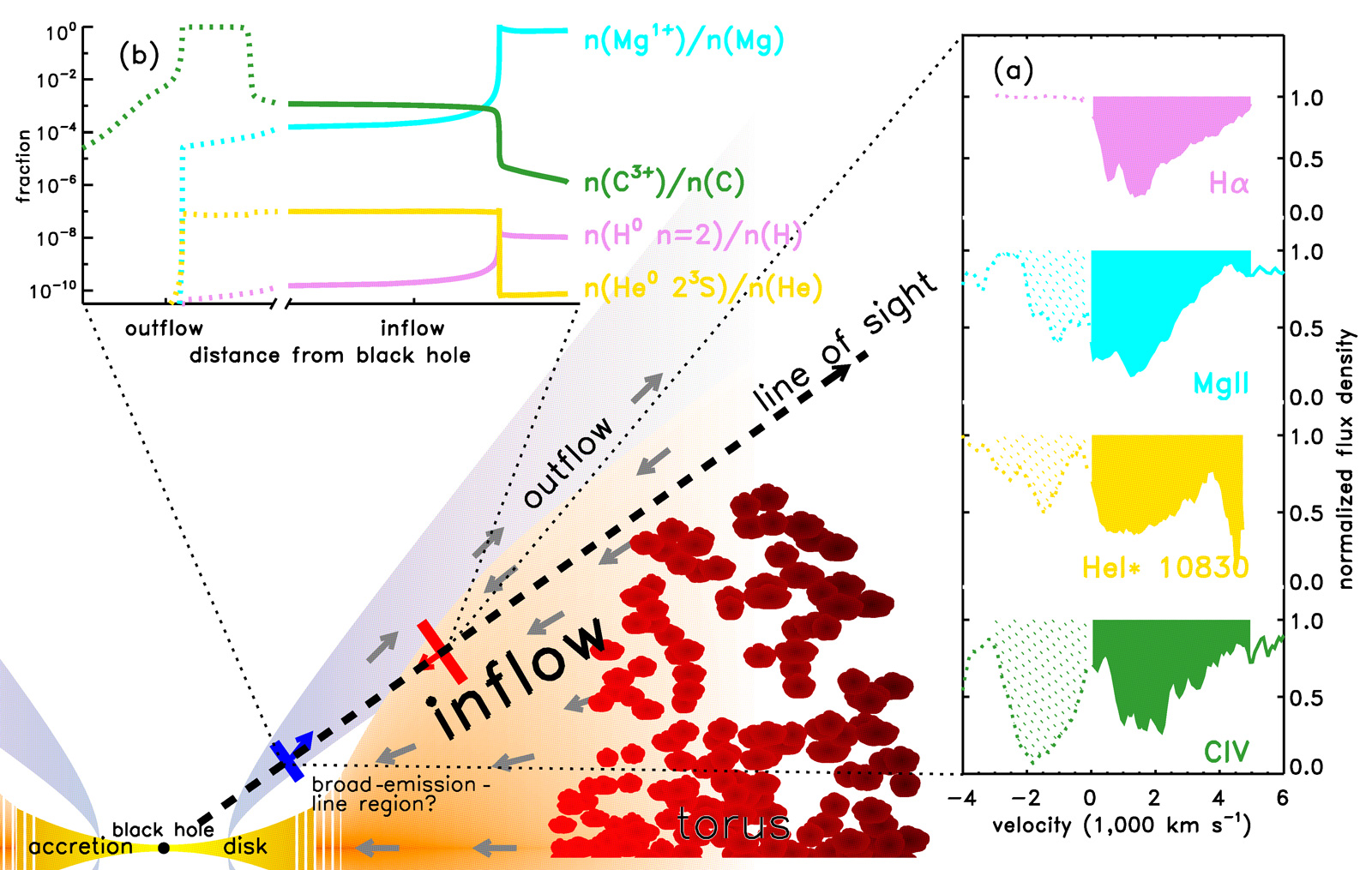 No. 5 Fall 2019 Palomar Science Highlight: Discovery of Inflow Fueling of Supermassive Black Hole Close to the Accretion DiskBy Xiheng Shi (Polar Research Institute of China) ![]() Schematic view of the central engine of quasars with an inflow reflecting our data on redshifted hydrogen and helium broad absorption lines. The parsec-scale inflow (grey arrows pointing towards the central black hole; positioned at few thousand gravitational radii, Rg, from the black hole) is located between an accretion disk and a dusty torus. The velocity of infalling gas (not shown) along the line of sight span from zero to as high as 5,000 km/s (roughly the freefall speed just beyond the outer radius of the accretion disk), indicating that the flow is being accelerated under the pull of the central black hole. A large amount of cold, dense and high-column-density gas, inferred from our absorption-line modelling, provides a direct and sufficient mass supply to feed the accretion disk. The inflow probably originates from the dusty torus, formed by materials therein that lose a substantial fraction of their angular momentum through various processes and hence fall inwards. Viewed at a modest inclination angle, the line of sight may intercept both the inflow and outflow (shown between the red and blue bars), leaving imprints as both redshifted and blueshifted broad absorption lines that are observed in J1035 + 1422 as an example. Four representative lines are shown at the top right in their common velocity space (cyan line, Mg II; green, C IV; pink, Hα; yellow, He I* λ10,830). The left inset shows the fraction of the corresponding ions (atomic levels) as a function of distance from the black hole. (X.Shi/PRIC) A research group from Polar Research Institute of China (PRIC) recently identified a fast gaseous inflow fueling the accretion disk around a supermassive black hole in the quasar J1035+1422. The discovery is based on the spectra obtained using the Palomar 200-inch telescope. The inflow is traced by a redshifted broad-absorption-line system. Located at the outer radius of the accretion disk, this inflow is the first case reported actually reaching the disk. The result is published in a Letter to Nature on September 4, 2019. ![]() Top: The observed spectrum of J1035+1422. The black line shows the observed flux; the green solid line represents the unabsorbed quasar template spectrum and the green dashed lines are the underlying power-law continuum. Bottom: Normalized broad-absorption-line spectrum (dark grey line). The redshifted broad absorption lines are normalized to the continuum only. By contrast, the blue-shifted He I λ10,830 line is normalized to the total flux of the modelled template. The cyan line represents the best-fit model of broad absorption lines. The blue dotted-dashed lines mark the rest wavelengths. The quasar systemic redshift is determined from narrow emission lines including [O II] (grey dotted-dashed vertical lines). (X.Shi/PRIC) The absorption-line system was originally detected through a systematic search in ~105 SDSS quasars with z < 1.3. In the follow-up campaign with the DBSP and TripleSpec spectrographs, the system was confirmed using H I Balmer absorption from H-α to H-η and metastable He I multiplets He I* ll3,188,3,889,10,830A in the optical and near-infrared spectra. The absorption trough spreads 0 - 5,000 km/s redshifted to the quasar's rest frame. This is the fastest and broadest among the sample of absorption line systems. This large velocity width implies a fast inward motion. Our photoionization simulation presented in the paper suggests that the inflow reaches 1,100 gravitational radii from the central engine, overlapping with the outer accretion disk. The inflow could originate near the inner surface of the dusty torus, and the mass flux rate is therefore about 15 – 36 solar masses per year, sufficient to power the quasar radiation and the outflow. Such inflow directly feeding the accretion disk is considered the last piece of the puzzle of quasar black hole accretion. Because of potential dust obscuration, such inflow around supermassive black hole could be much more common in quasars than as suggested by ultraviolet and optical spectra. Absorption/emission lines in the infrared, (sub)millimetre and radio wavelengths, where dust obscuration is small or negligible, could be more powerful means to study these disk-feeding inflows. Upgraded P3K Returns to Science OperationsBy Seth Meeker (JPL) PALM-3000 (P3K), the Palomar 200-inch facility adaptive optics system, has undergone a significant upgrade during the 2019B observing semester, concluding with a successful re-commissioning phase in September/October 2019 and a return to science operations as scheduled on 08 November 2019. The main features of this upgrade are: 1) the original frame-transfer CCD wavefront sensor (WFS) is upgraded to an OCAM2K EMCCD capable of 3.5 kHz framerates; 2) new real-time control (RTC) hardware and software based on advanced Digital Signal Processor (DSP) boards has replaced the aging GPU based RTC system. ![]() 85% K-band Strehl achieved on SAO 090696, mV=7.88 M3, on 8 October 2019. The diffraction limited core has a FWHM of 3.4 pixels or 85 mas. The ghost to the lower right of the PSF core is from the ND filter in PHARO. (S.Meeker/JPL) Similar to the pre-upgrade system, P3K’s Shack-Hartmann WFS supports multiple pupil sampling modes using a motorized lenslet stage, and these pupil sampling modes are being released to general observing in phases. The default sampling mode with 64×64 sub-apertures was the first to be tested on-sky during the September/October re-commissioning, and is now available for normal science observations. In 64× mode the upgraded P3K is already achieving K-band Strehl ratios‐the ratio of PSF core intensity vs. a theoretically perfect PSF—up to 85% on-sky and can lock on natural guide stars (NGS) as faint as mV=16, rivaling or exceeding the natural gu