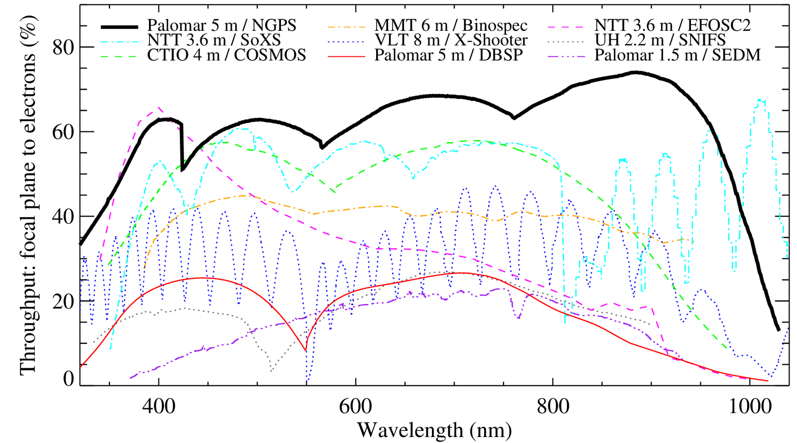 No. 7 Fall 2020 NSF Support SuccessBy Andy Boden (Caltech) Palomar Observatory is excited to report that a number of new and/or recurring initiatives have been successful in obtaining National Science Foundation (NSF) support in the most current round of awards. First we are excited to advise that the Zwicky Transient Facility will be supported by the NSF Mid-Scale Innovations Program (MSIP) for a second phase of operation, again under the leadership of Shri Kulkarni. ZTF saw first light in 2017 with a custom 600-Mpix camera, operates on the Samuel Oschin Telescope and the Palomar 60-inch telescope, and uses the Hale and other large telescopes for transient event follow up. Next we are excited to announce that the new Hale Telescope facility optical spectrograph concept, the Next Generation Palomar Spectrograph (NGPS), received NSF development support. The proposal effort was led by Evan Kirby, and was selected for funding by the NSF Major Research Instrumentation (MRI) program. NGPS is envisioned as a replacement for the venerable facility Double Spectrograph, and is being jointly developed by Caltech and the National Optical Observatories of China (NAOC). We anticipate first light with NGPS in 2023. We are similarly excited to announce that a novel ground-layer adaptive optics (GLAO) system called SIGHT was also selected for NSF Advanced Technologies and Instrumentation (ATI) funding under the leadership of Richard Dekany. SIGHT will demonstrate a new paradigm for compact ground-based AO in its LGS mode: non-diffraction-limited panchromatic image improvement spanning 330 – 2400 nm wavelengths. Coupled with NGPS the addition of SIGHT promises to provide Hale Telescope observers with a total spectroscopic observing efficiency 5 – 10X that of DBSP when SIGHT becomes operational in 2023. Finally, CryoScope, a novel wide-field near-IR telescope development effort led by Roger Smith has been selected for NSF ATI funding. This cryogenic telescope, operating at −100 ℃, will be a proof-of-concept development fielded at Palomar, a pathfinder for future near-IR transient survey instruments complementary to both ZTF and the Simonyi Survey Telescope at the Vera Rubin Observatory. The Next Generation Palomar SpectrographBy Roger Smith (Caltech) COO and NAOC/NIAOT are collaborating to develop a general-purpose optical spectrograph to replace the workhorse Double Spectrograph (DBSP, commissioned in 1982). NGPS is designed to greatly improve both optical throughput (e.g. by a rough factor of three at 600 nm relative to DBSP) and operational efficiency through streamlined acquisition and setup. Financial support from the Heising-Simons Foundation and the NSF has enabled the implementation of a four-channel design which makes use of the existing 4K × 2K CCDs from DBSP and SWIFT to provide 16K pixels in the spectral direction. The fixed grating configuration provides simultaneous wavelength coverage from 320 nm to 1030 nm with R = 4600 in the center of each for four bands when slit width projects to 2.7 pixels, as would be appropriate in median seeing. ![]() Throughput loss mechanisms as a function of wavelength. CCD QE is the most significant in U and G bands and could be improved in future. The grating efficiency roll off is greatest at band edges and is thus minimized by division of light into many channels. U band is placed first in the dichroic sequence to minimize losses. [more] (E.Kirby/Caltech) ![]() Predicted open-slit optical throughput of NGPS compared to the measured optical throughput of selected spectrographs. (SoXS will be commissioned soon, so its curve is also a prediction.) For COSMOS, Binospec and DBSP (in red), the instantaneous wavelength coverage is significantly narrower than the ranges of these curves for anything but their lowest resolution modes. SoXS, X-Shooter, and the reciprocal spectrograph to EFOSC2 (SOFI) extend into the NIR (not shown). [more] (E.Kirby/Caltech) A 60" wide rectangular section of the telescope focal plane is subdivided into three slices by two moveable pickoff mirrors. Light falling between the pickoff mirror passes directly to the spectrograph without losses. The lateral slices are then re-imaged to the sides, reformatting the image as a single “slit” with slightly more than 3 times the spatial extent. The new slicer design keeps the entire 60 arcsecond pickoff mirror edge in focus and allows the width of all slices to be adjusted to maintain the best trade-off between resolution and slit losses under varying seeing conditions. When fed by a new adaptive optics system (see companion article on SIGHT), the slit width can be reduced to 2 pixels delivering R = 6000 while also improving SNR by concentrating light in the central image slice. In addition to reducing slit losses, the 3-way slicer achieves R = 4600 with a relatively small (100 mm) beam which in turn allows a single element off-axis collimator to be used. Dichroics just behind the slicer direct light radially to separate collimators to produce a short-wide layout, which is expected to exhibit lower flexure than axial layouts like DBSP. Like most modern spectrographs, volume phase holographic gratings are used for high efficiency. The small beam size leads to refractive cameras with few optical surfaces and low absorption losses. Each channel employs highly optimized AR coatings and high reflectivity dichroic coatings and suffer relatively low roll-off in grating efficiency due to the restricted wavelength range. These factors combine to deliver very competitive throughput (see accompanying figures), even without accounting for the reduction of slit losses afforded by the slicer. Throughput could be improved further by upgrading U and G band CCDs, but this is beyond the scope of the current project. Equal attention is being paid to operational efficiency. Focus and flexure compensation will occur automatically during observations. Calibration light will be delivered to the ends of slices